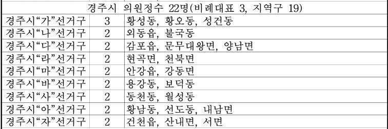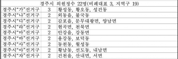 9개 지역 선거구는 ▷가 선거구 : 황성동. 황오동. 성건동 (3명) ▷나 선거구 : 외동읍. 불국동 (2명) ▷다 선거구 : 감포읍. 문무대왕면. 양남면 (2명) ▷라 선거구 : 현곡면. 천북면 (2명) ▷마 선거구 : 안강읍. 강동면 (2명) ▷바 선거구 : 용강동. 보덕동 (2명) ▷사 선거구 : 동천동. 월성동 (2명) ▷아 선거구 : 황남동. 선도동. 내남면 (2명) ▷자 선거구 : 건천읍. 산내면. 서면 (2명)으로 최종 확정됐다. |